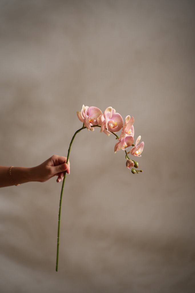 Orkidé i ljusrosa, 75 cm. De sirliga stänglarna och de eleganta blommorna ger ett sofistikerat uttryck. Perfekt för dig som vill ha en exklusiv känsla utan underhåll.